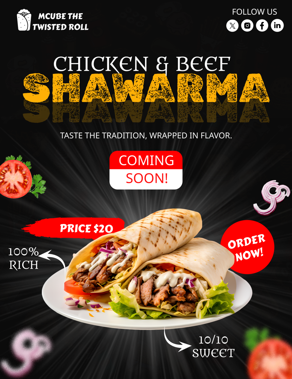 Spice up your marketing with this Shawarma poster design — a mouthwatering visual that captures the sizzling appeal of this popular street food. Perfect for kebab shops, Middle Eastern restaurants, or food festivals, this design blends rich imagery with bold typography to make customers crave your flavors.